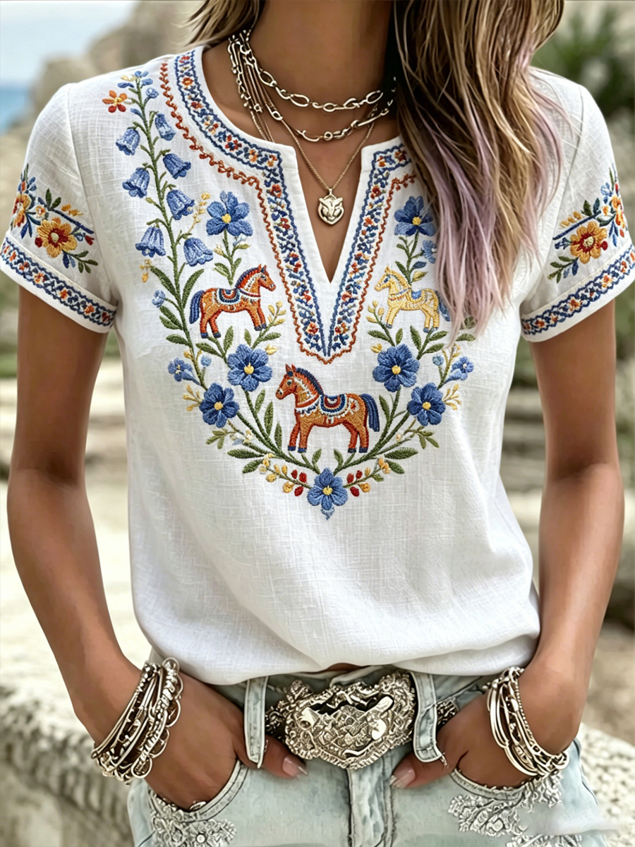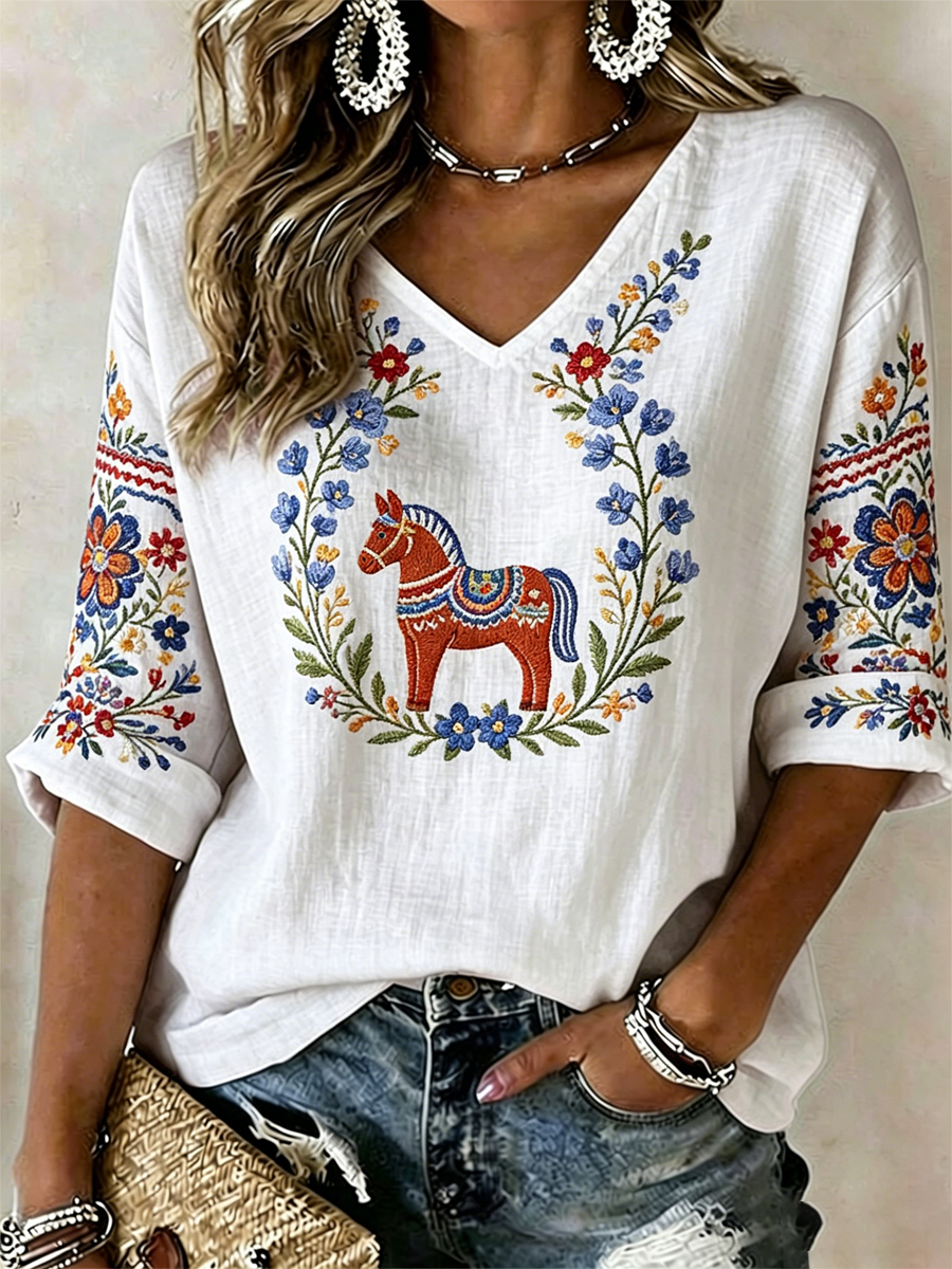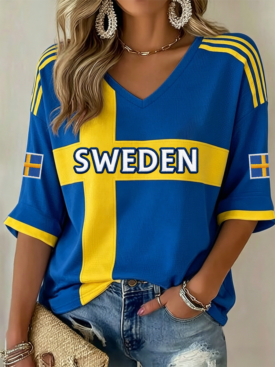 Damsvensk midsommartryck V-ringning avslappnad t-shirt