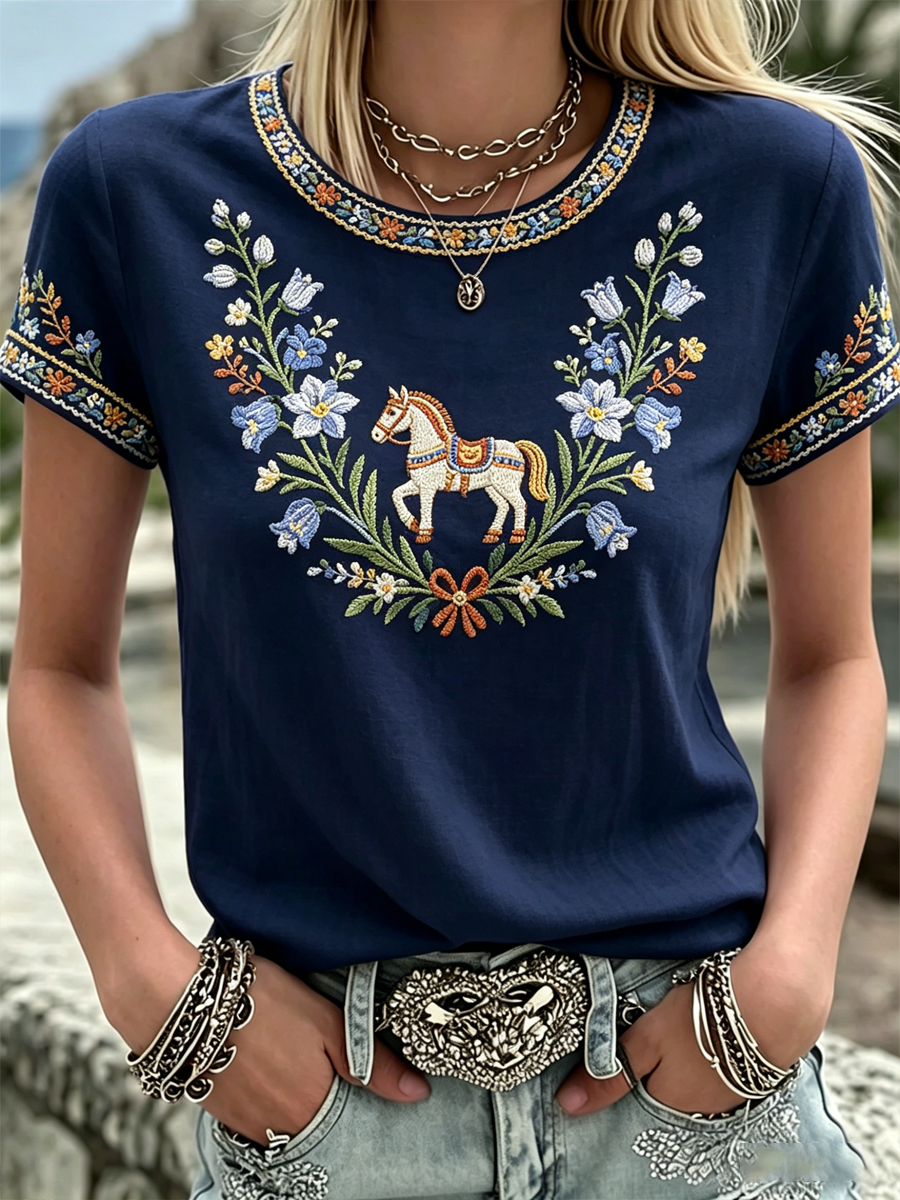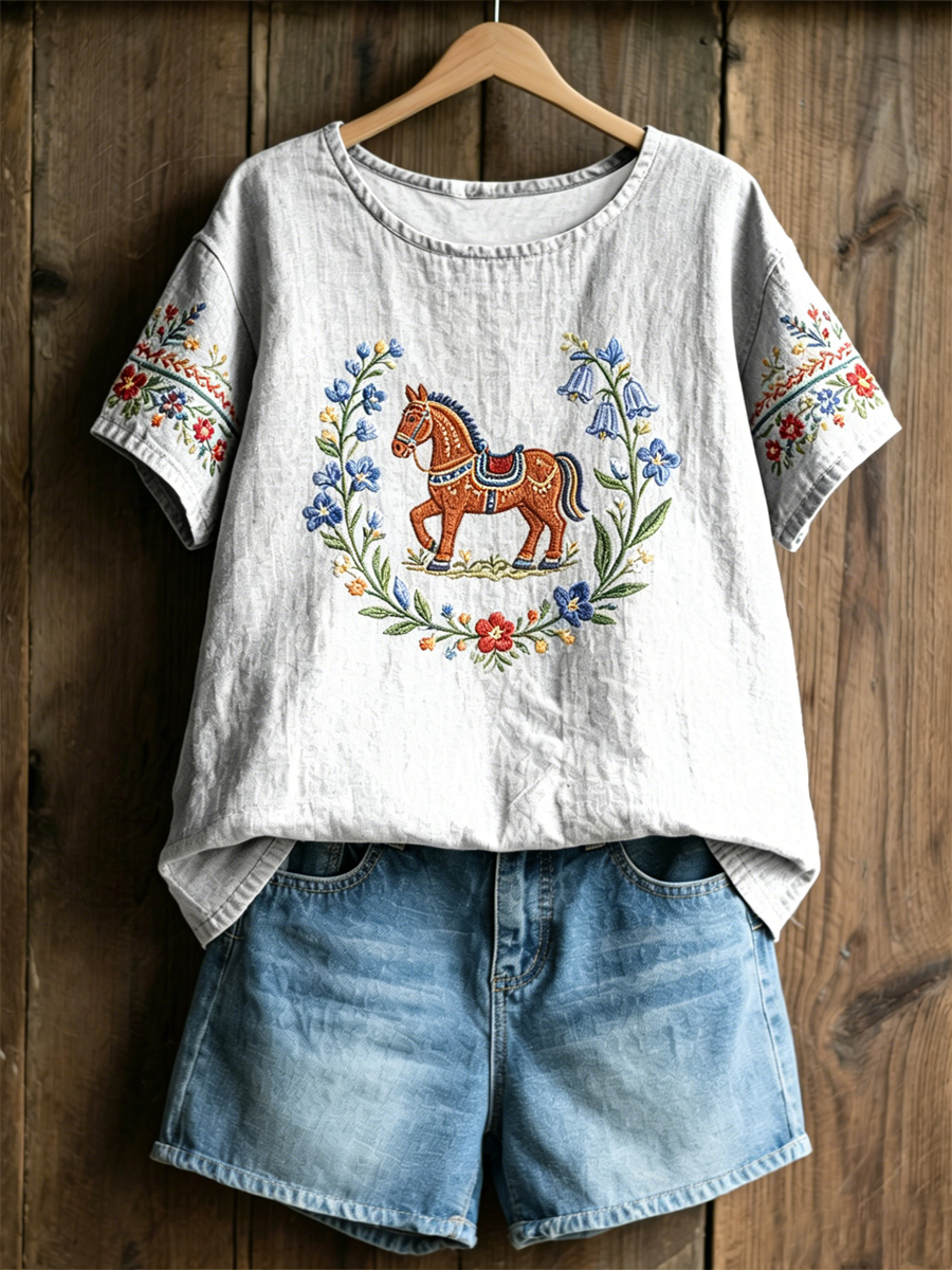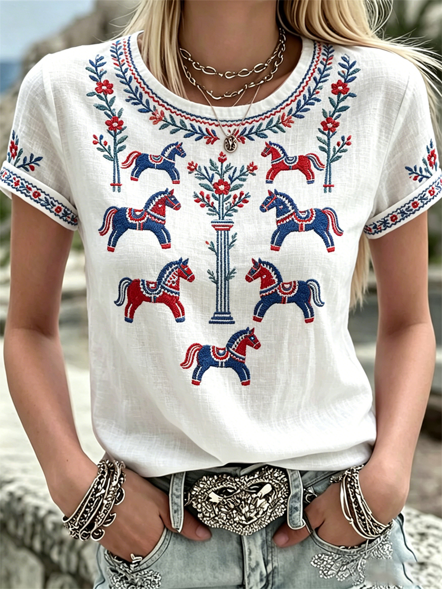 Damsvensk midsommartryck avslappnad t-shirt